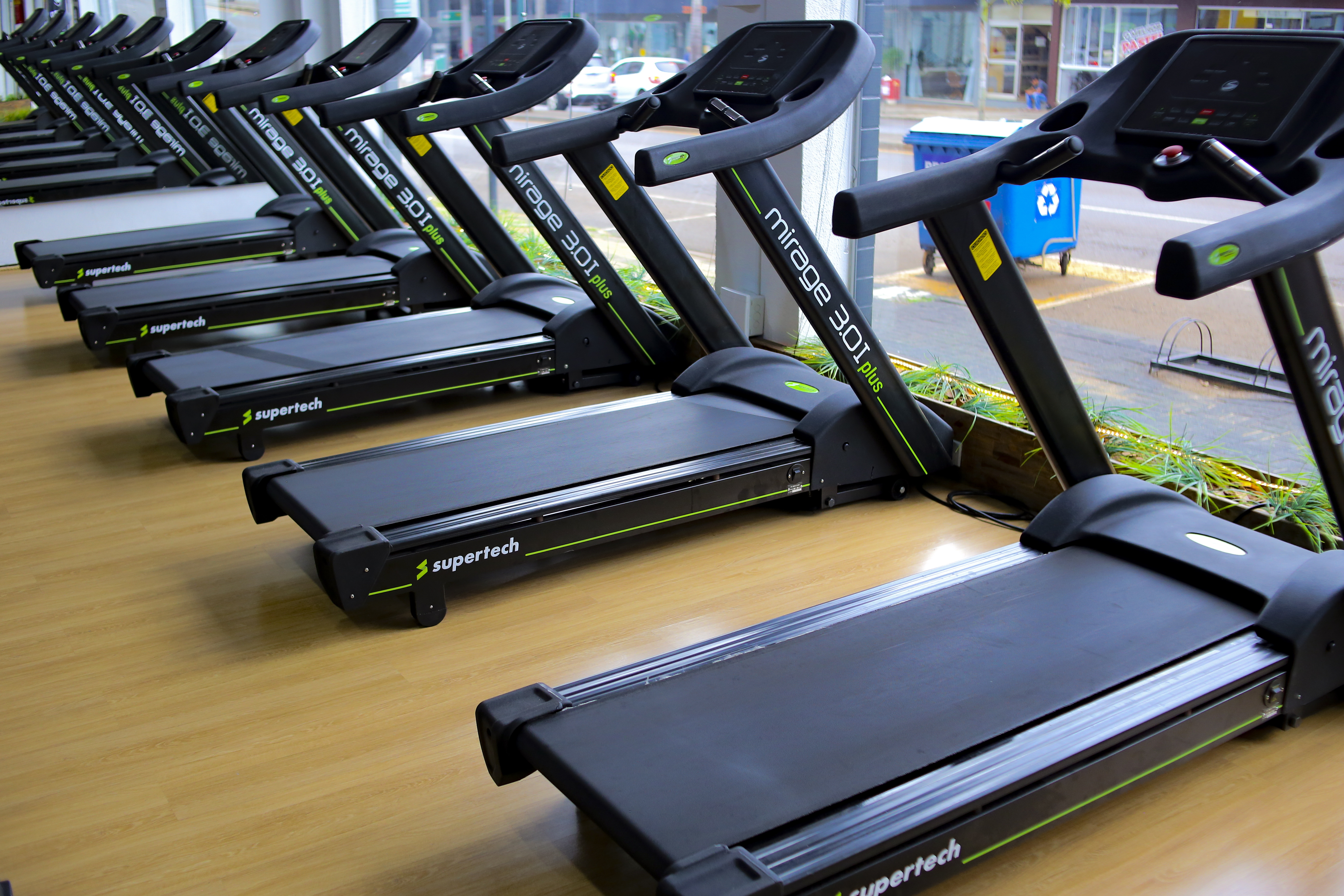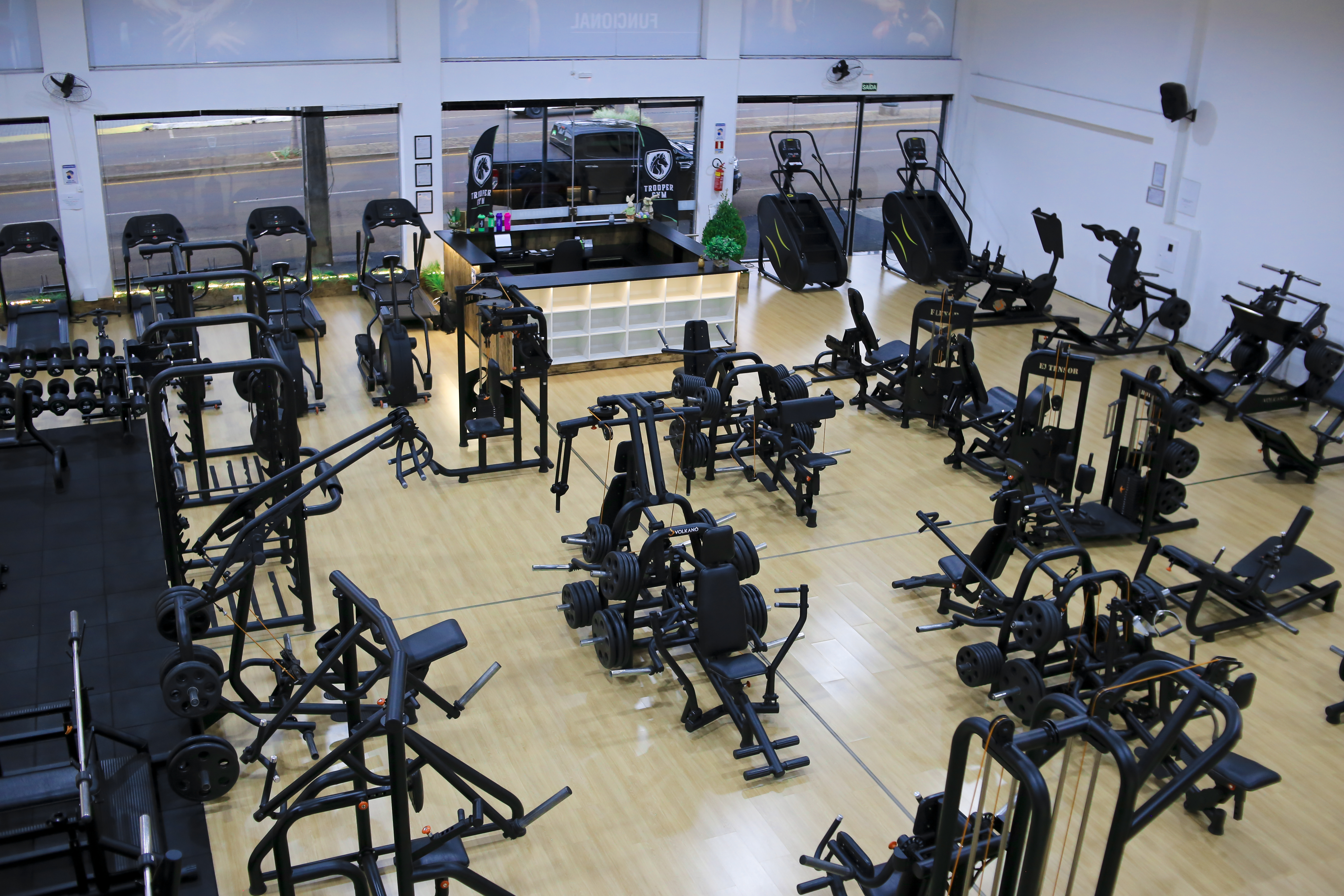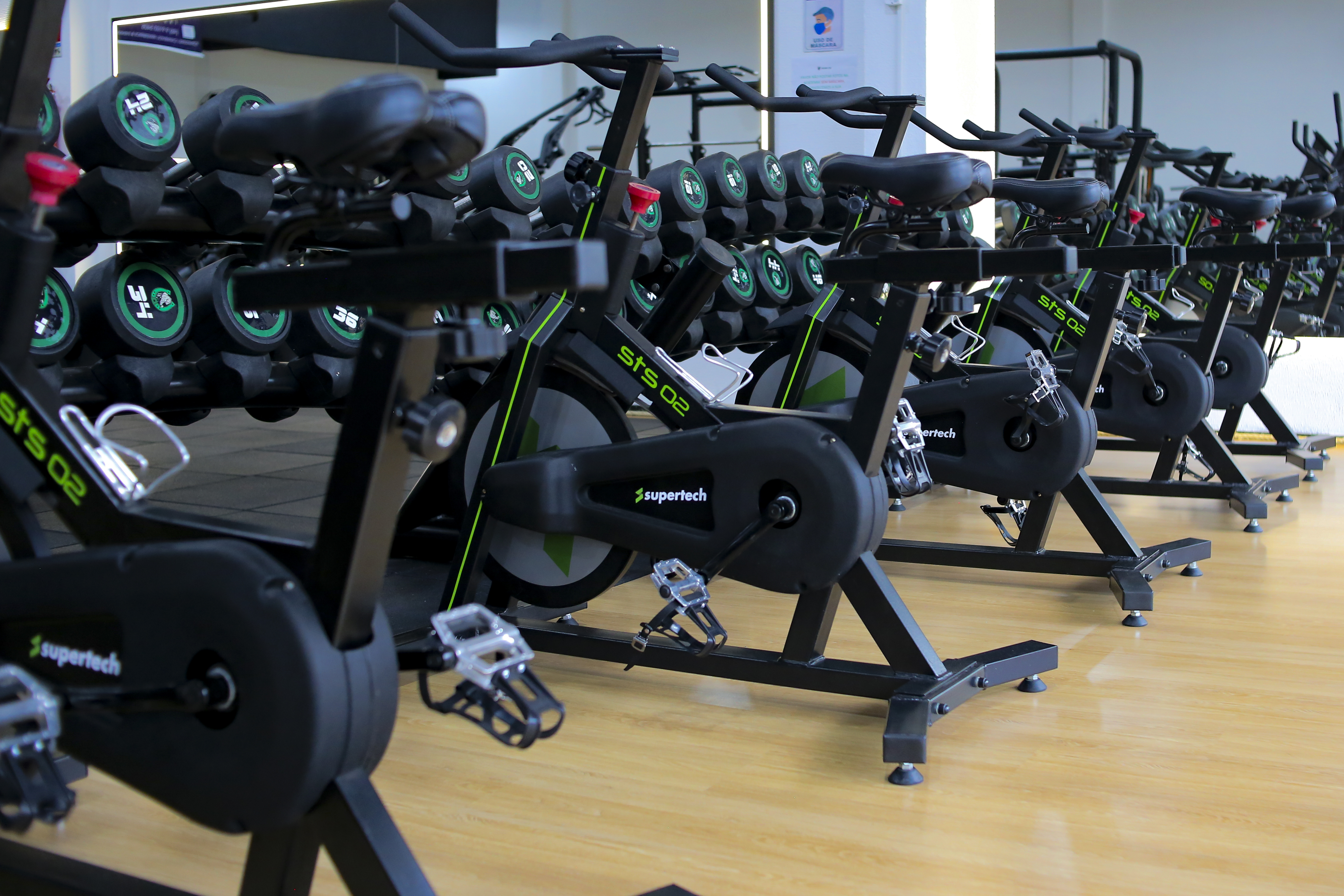 Caneleiras, colchonetes e steps suficientes para um fluxo de até 80 alunos simultâneos na sala.